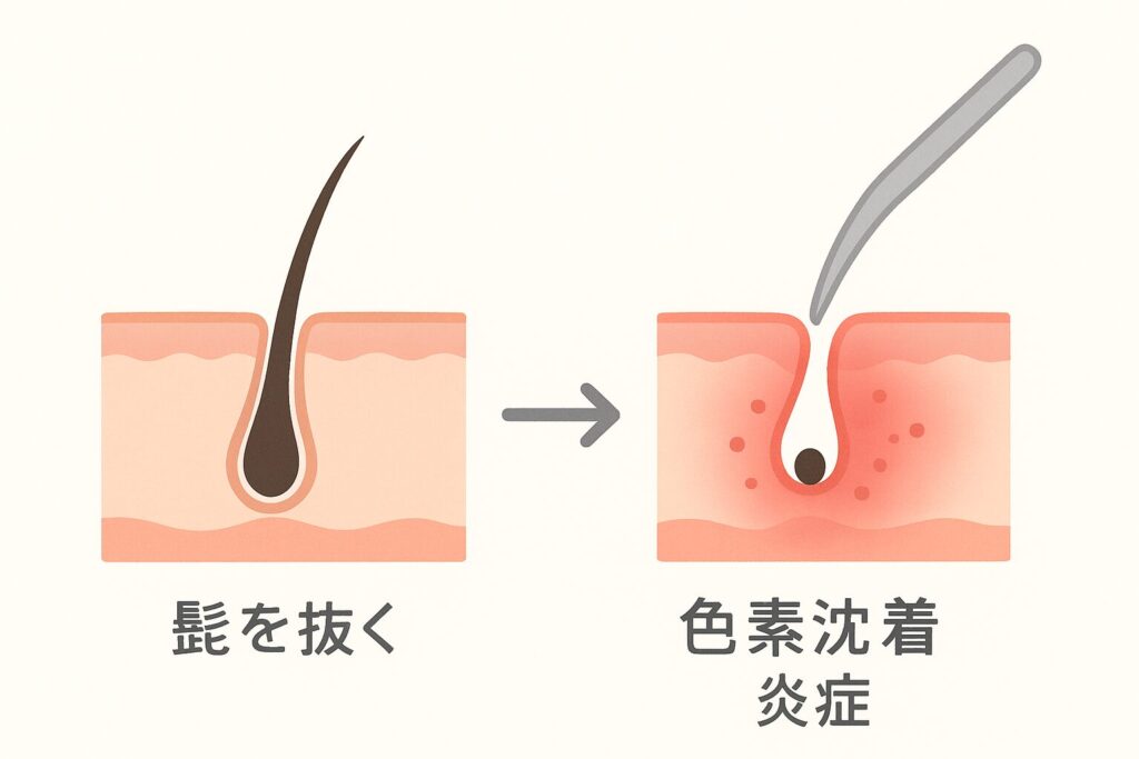 人間の体は、傷がつくと守るためにメラニン(色素)を作るという仕組みがあるため、抜くと黒ずみができてしまい、これが常習的になると色素沈着してしまいます。