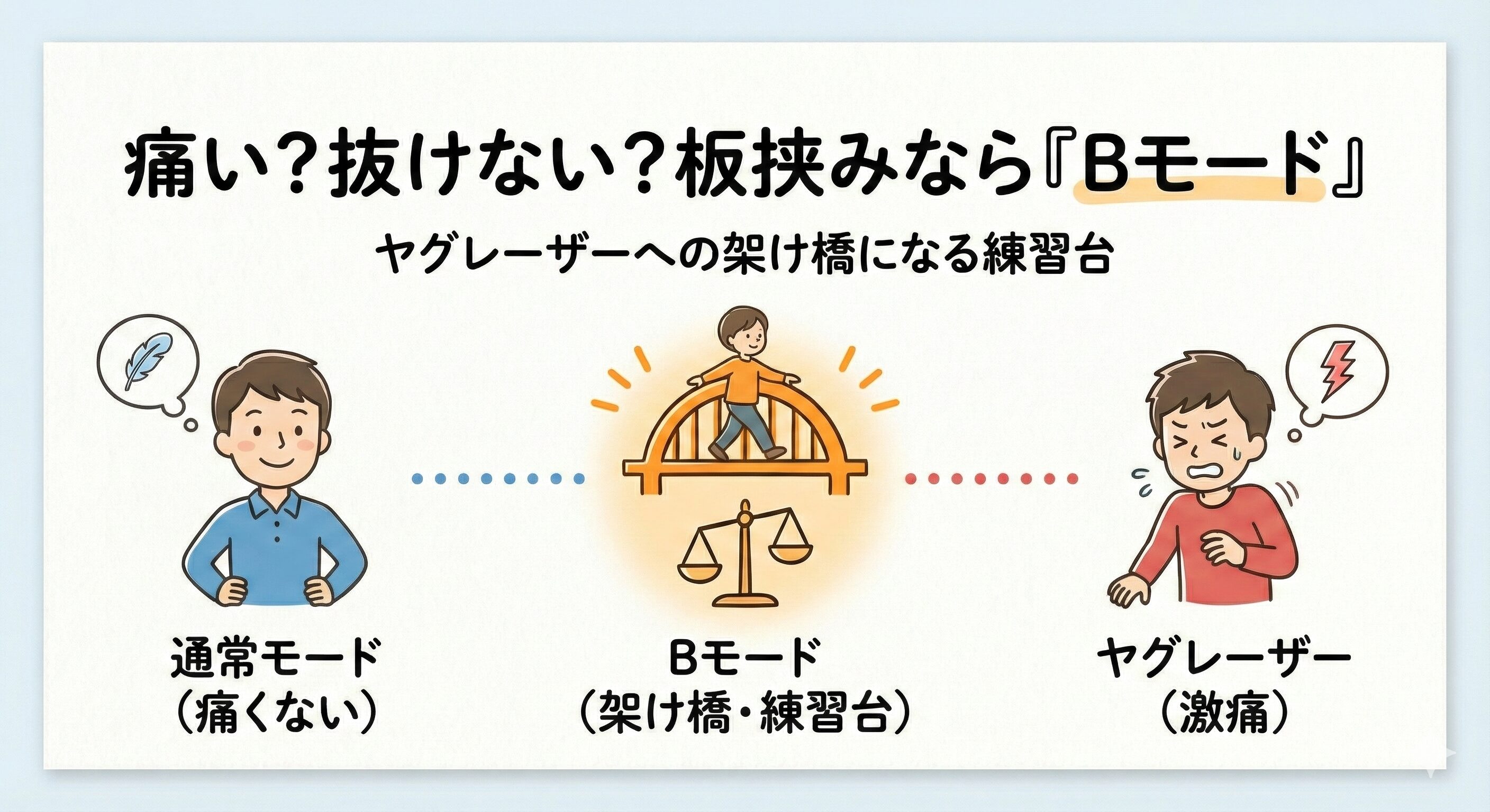 いきなりヤグレーザーという「エベレスト」に登ろうとすると、痛すぎて挫折します。その前に、Bモードという「高尾山」で体を慣らしておく。これこそが、痛みに弱い人が確実に脱青髭するための慎重な戦略です。