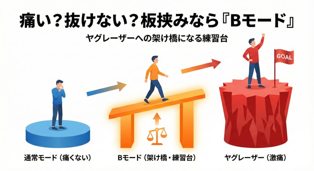 - でも、いきなりヤグに行くのが怖いなら、Bモードを「3段階ステップアップの架け橋」として利用すべき。